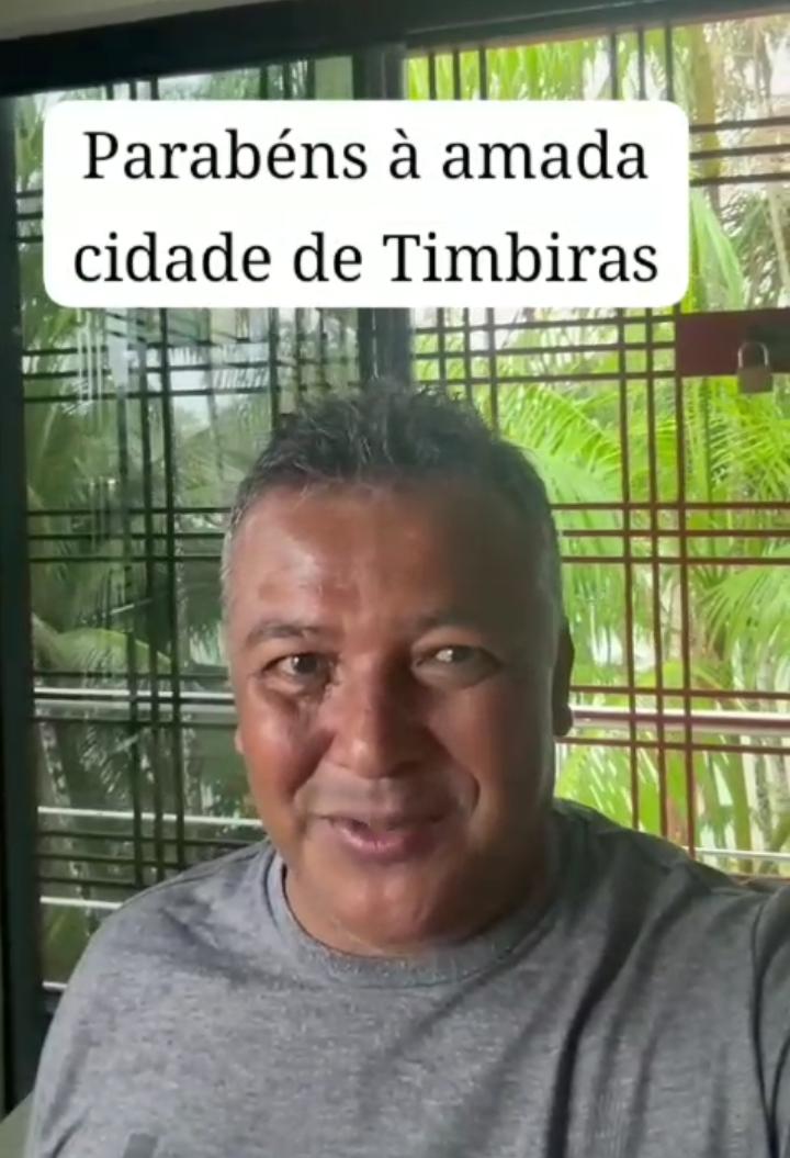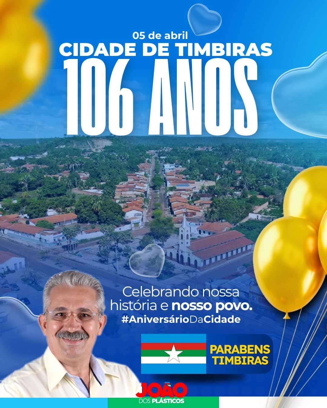 Nesta ocasião oportuna, quero parabenizar a nossa querida Timbiras. Esta terra amada, completa hoje, dia 05 de Abril, 106 anos de história, lutas, desafios e conquistas. Nossa cidade é formada por um povo alegre, trabalhador, perseverante, forte e acolhedor.