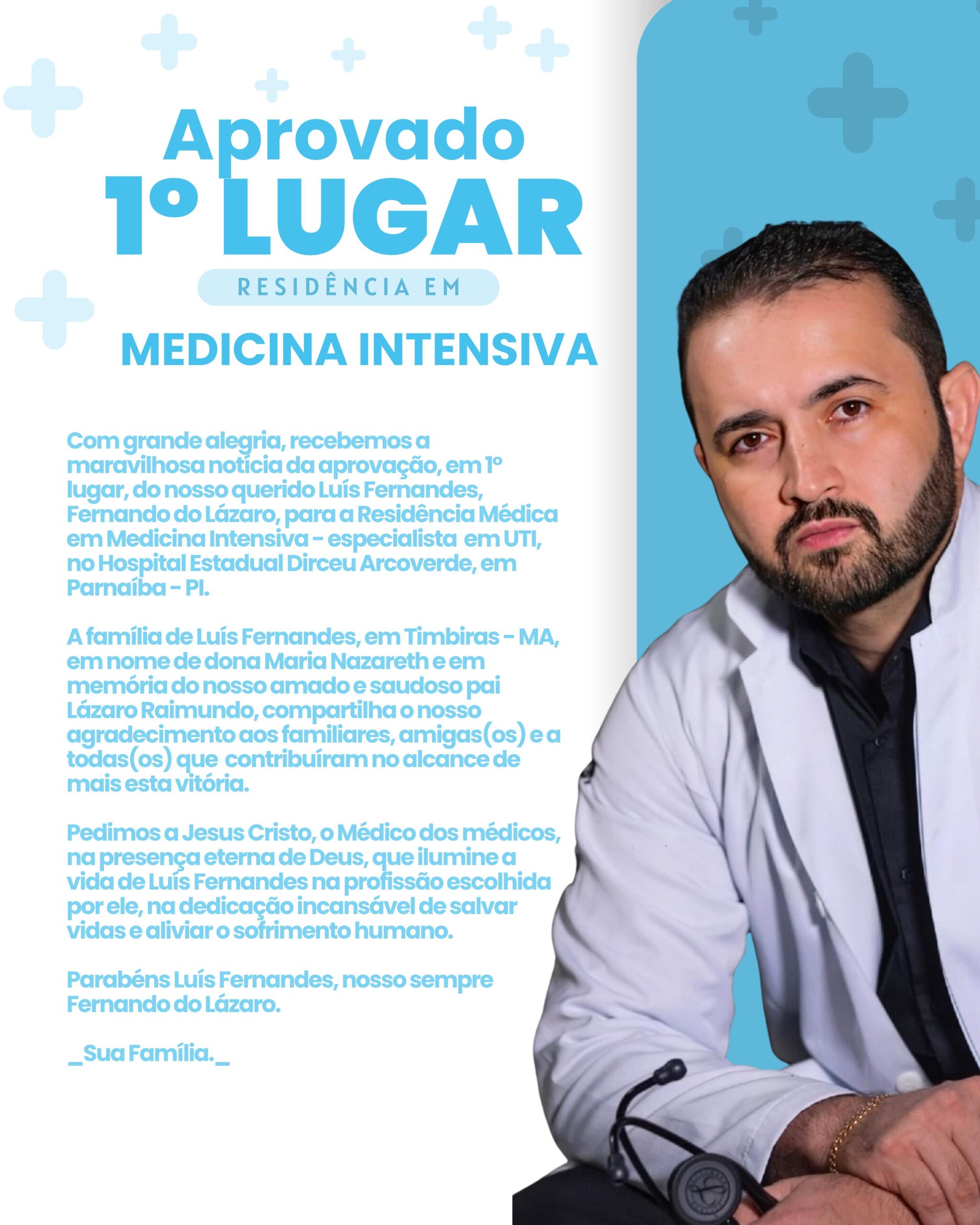 O jovem médico Luís Fernandes foi aprovado em primeiro lugar na residência de Medicina Intensiva do Hospital Estadual Dirceu Arcoverde, em Parnaíba (PI). A conquista representa um marco importante em sua trajetória acadêmica e profissional, destacando-se entre dezenas de candidatos que disputaram a vaga.
