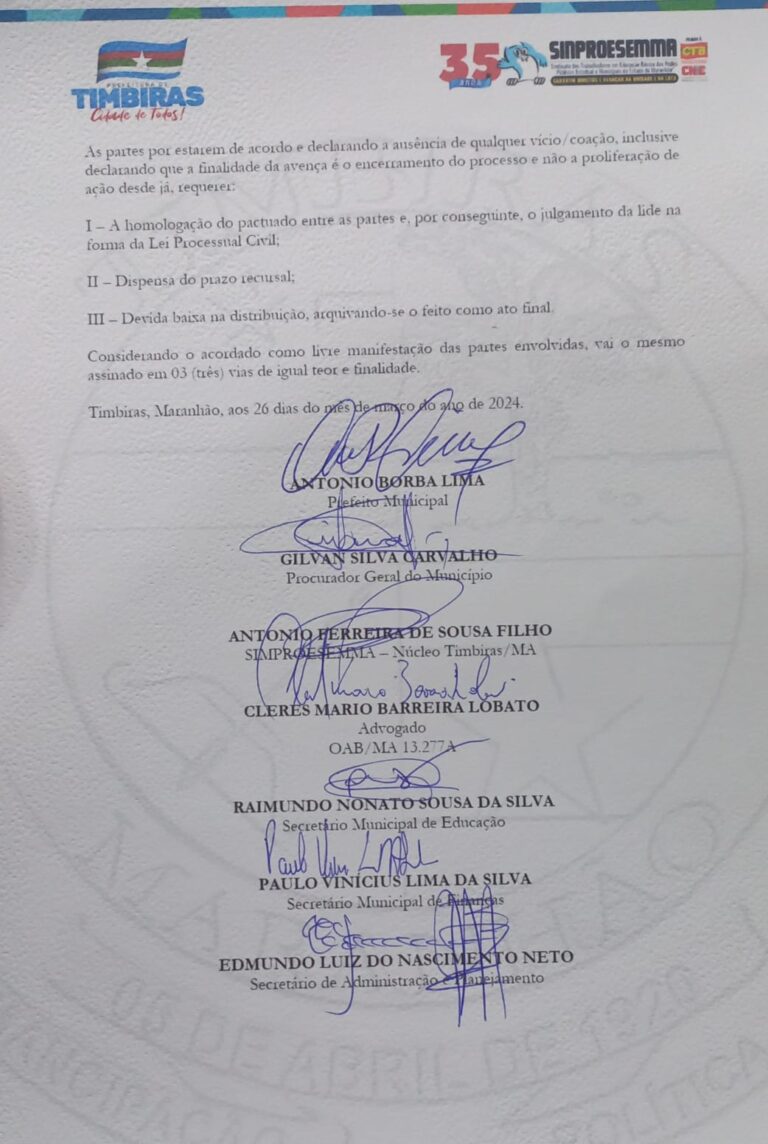 Na ocasião, o prefeito na época, Antônio Borba, ao lado de representantes da prefeitura e legislativo, propôs e assinou com o sindicato dos profissionais da educação (SINPROESEMMA/APEMT), documento de acordo para por fim a mais de 6 anos de embate entre prefeito e professores no tocante ao reajuste/retroativo do ano de 2018, causa vencida pela categoria em duas instâncias judiciais. Pois bem, para a surpresa e decepção dos professores de Timbiras, esse acordo que o próprio prefeito propôs e assinou diante da categoria, ele NÃO CUMPRIU o acordado entre a prefeitura e o sindicato dos professores de Timbiras.