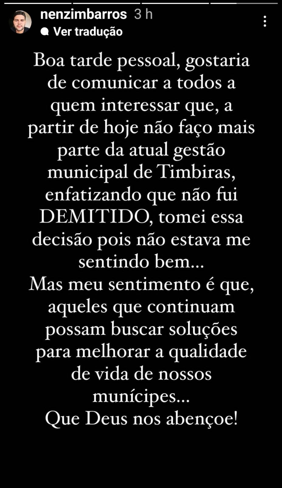 Veja na íntegra o que postou Nenzim em suas redes sociais: