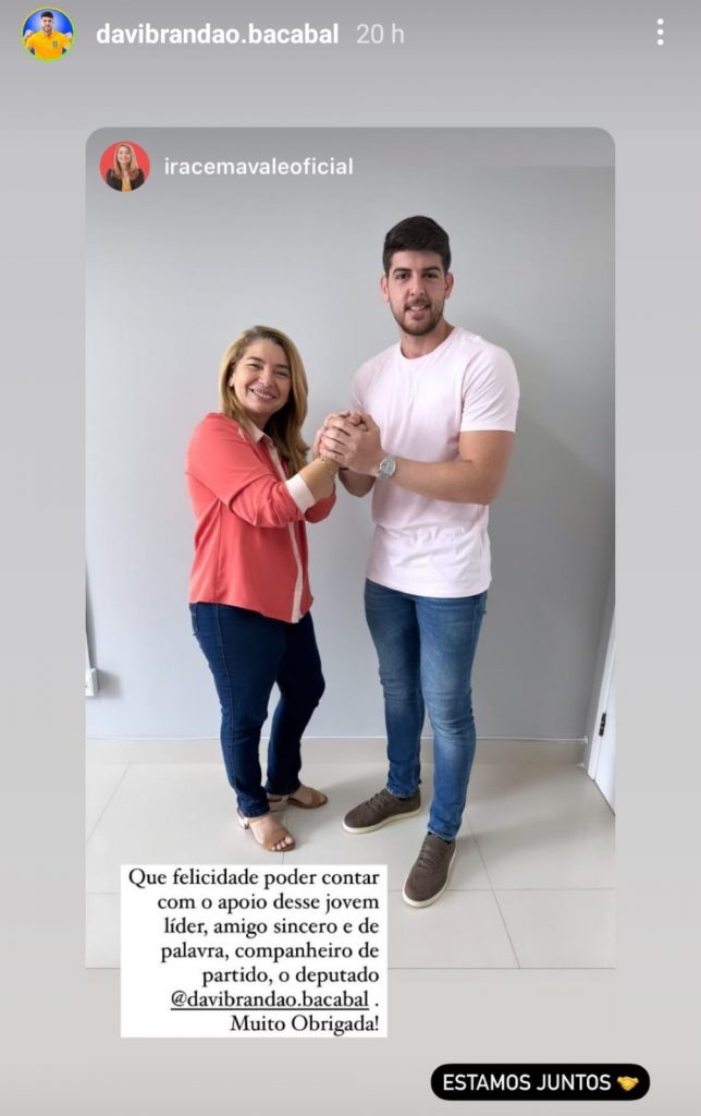 Um dia depois, o deputado eleito repostou em seu perfil no Instagram uma publicação da própria Iracema que agradecia pelo seu voto, confirmando assim que irá seguir as orientações de Brandão na eleição da Assembleia.