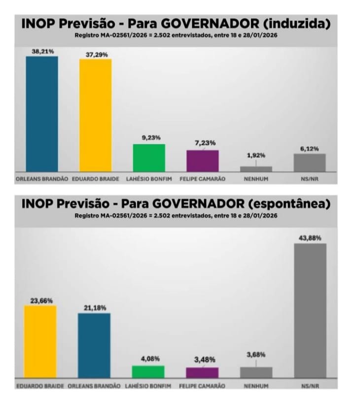 Uma nova pesquisa do Instituto INOP PREVISÃO, registrada na Justiça Eleitoral (MA-02561) e contratada pelo Jornal Pequeno, mostra que a disputa pelo Governo do Maranhão segue equilibrada, mas com Orleans Brandão (MDB) em destaque na percepção do eleitor.