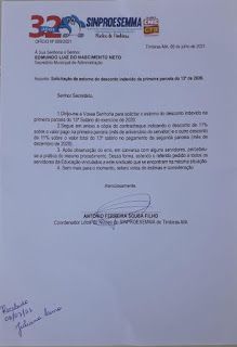 SINPROESEMMA DE TIMBIRAS SOLICITA ESTORNO DE DESCONTO INDEVIDO NO PAGAMENTO DO 13º SALÁRIO DO ANO DE 2020